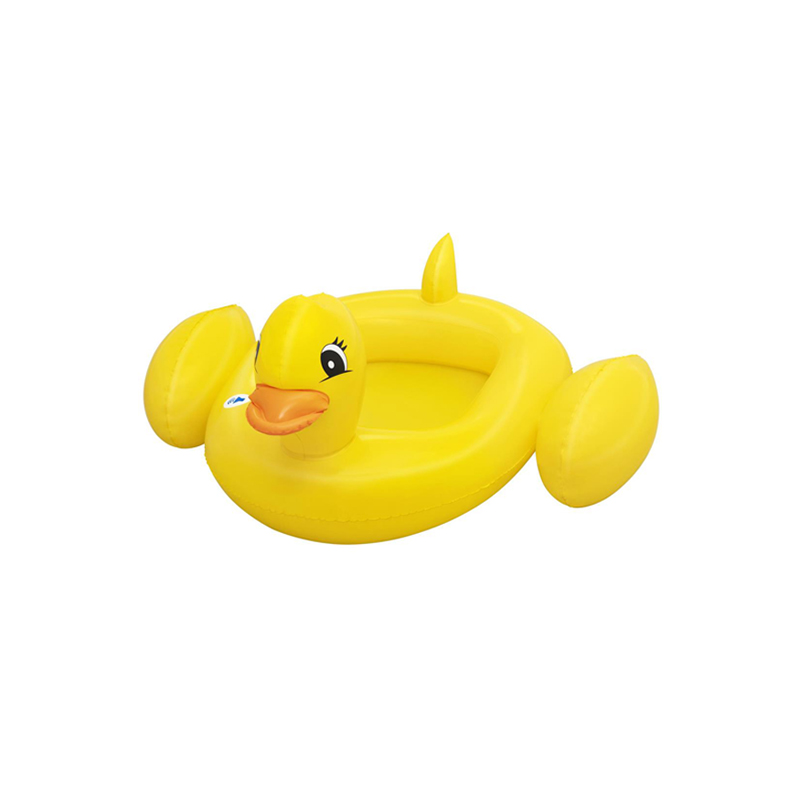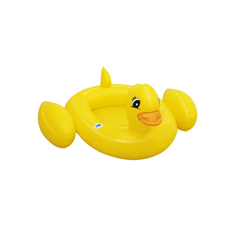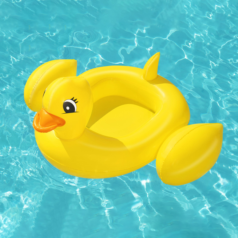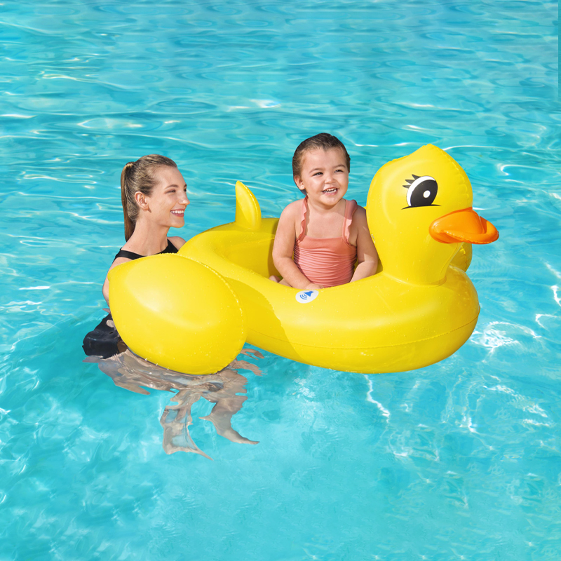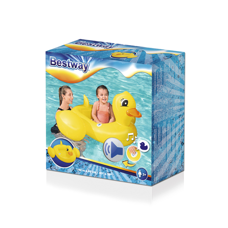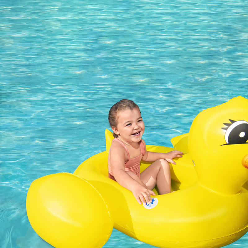 Our Bestway® Funspeakers™ children’s inflatable boat in a playful duck design is causing a sensation this summer! This cute, innovative inflatable boat has a very special surprise in store. An integrated speaker generates realistic duck noises at the push of a button. Thanks to the simple construction, our exclusive integrated Funspeakers™ technology and the long-lasting battery performance, your children will have a lot of fun with this inflatable boat summer after summer. Thanks to the comfortable seat, they can enjoy optimal comfort when splashing about.