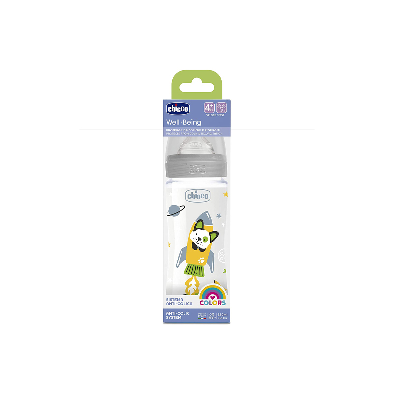Ideal for everyday use. Chicco Baby Bottle 330ml Plastic With Fast Flow Nipple Made of high quality plastic suitable for food, the Well Being 330ml baby bottle facilitates the feeding of the baby after the first months of life thanks to the fast flow nipple.