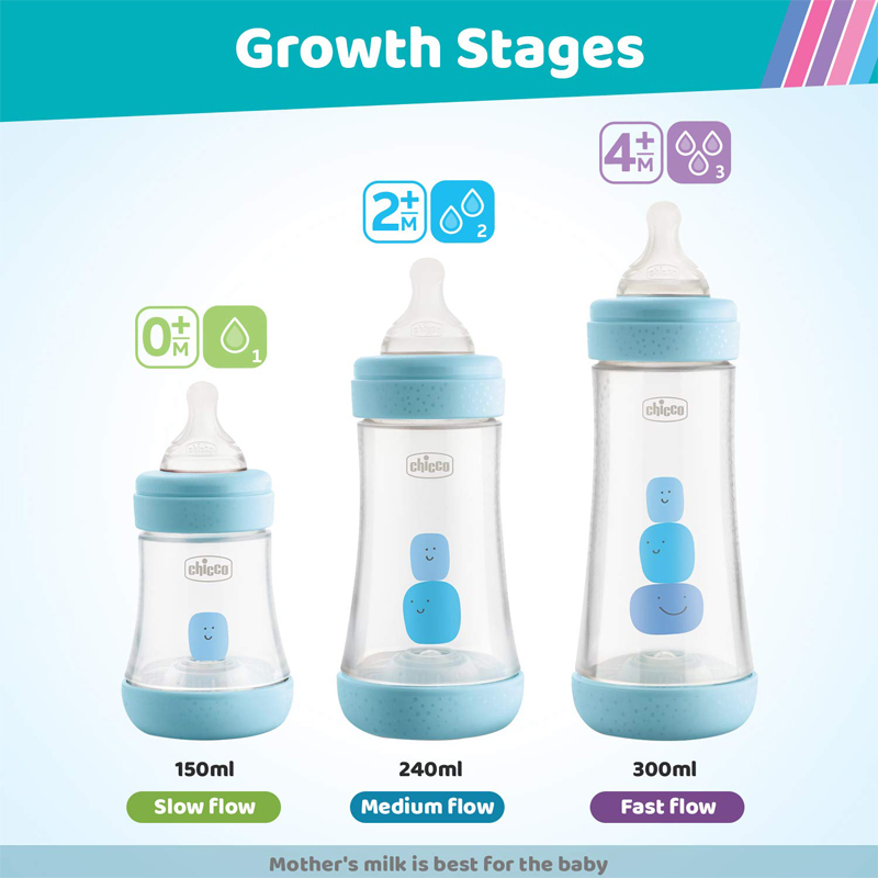 Perfect 5 is the only bottle with the innovative Intui-flow system, patented by Chicco, which combines the Physio Teat with the Equilibrium membrane to facilitate feeding in an intuitive and physiological way, naturally favoring sucking rhythm and intensity of each baby at each feeding, constantly adapting to the amount of air in the bottle and promoting a proven anti-colic effect.