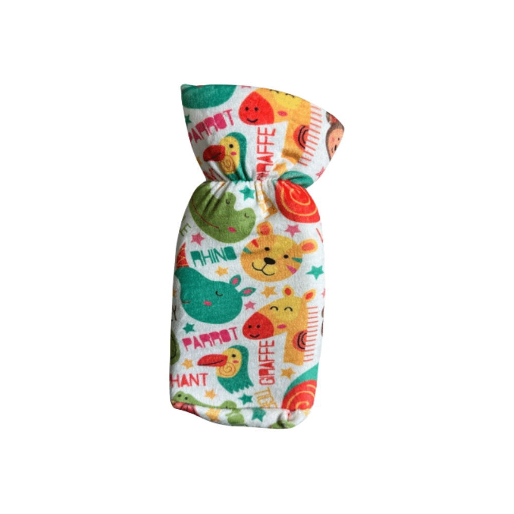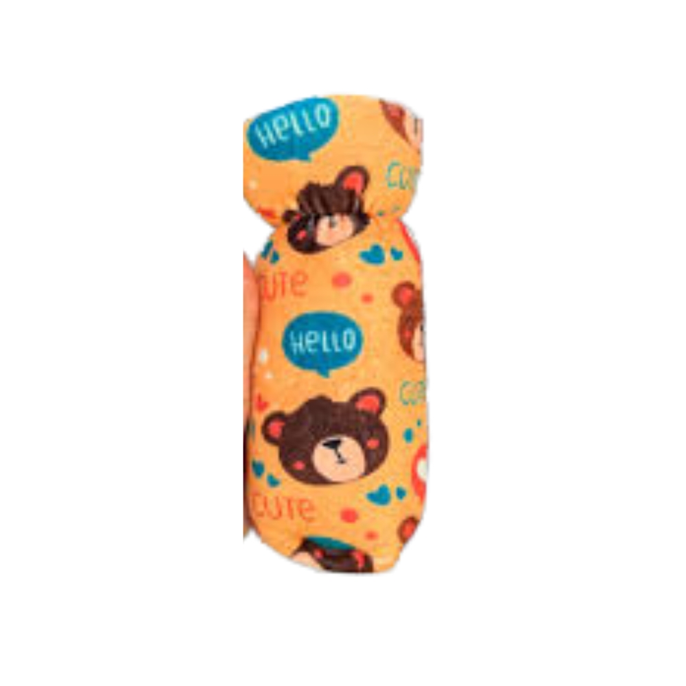 A padded outer cover for a baby bottle, designed to protect it from breakage. It keeps the bottle clean and protects it from dust and germs. Made of high-quality, washable materials. Features a colorful design and vibrant colors. Fits most bottle sizes.