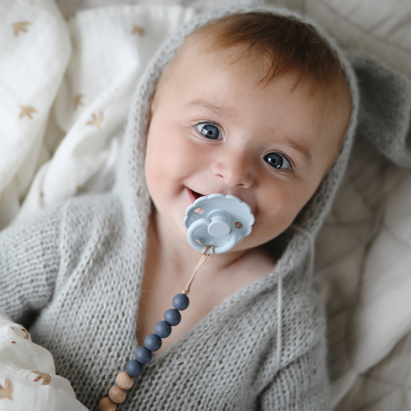 The FRIGG line of natural soothers has been thoughtfully designed for your baby’s comfort. The outward curve keep the soother off their delicate skin, whole features like air holes and a security handle ensure your baby stays safe. Available in a range of soft colors, FRIGG soothers make a beautiful addition to your collection of baby essentials. The nipple is made of 100% natural rubber latex which is soft and flexible. The rubber is a natural material, color variations may occur. 100% free from BPA, PVC and phthalates. Designed and manufactured in Denmark